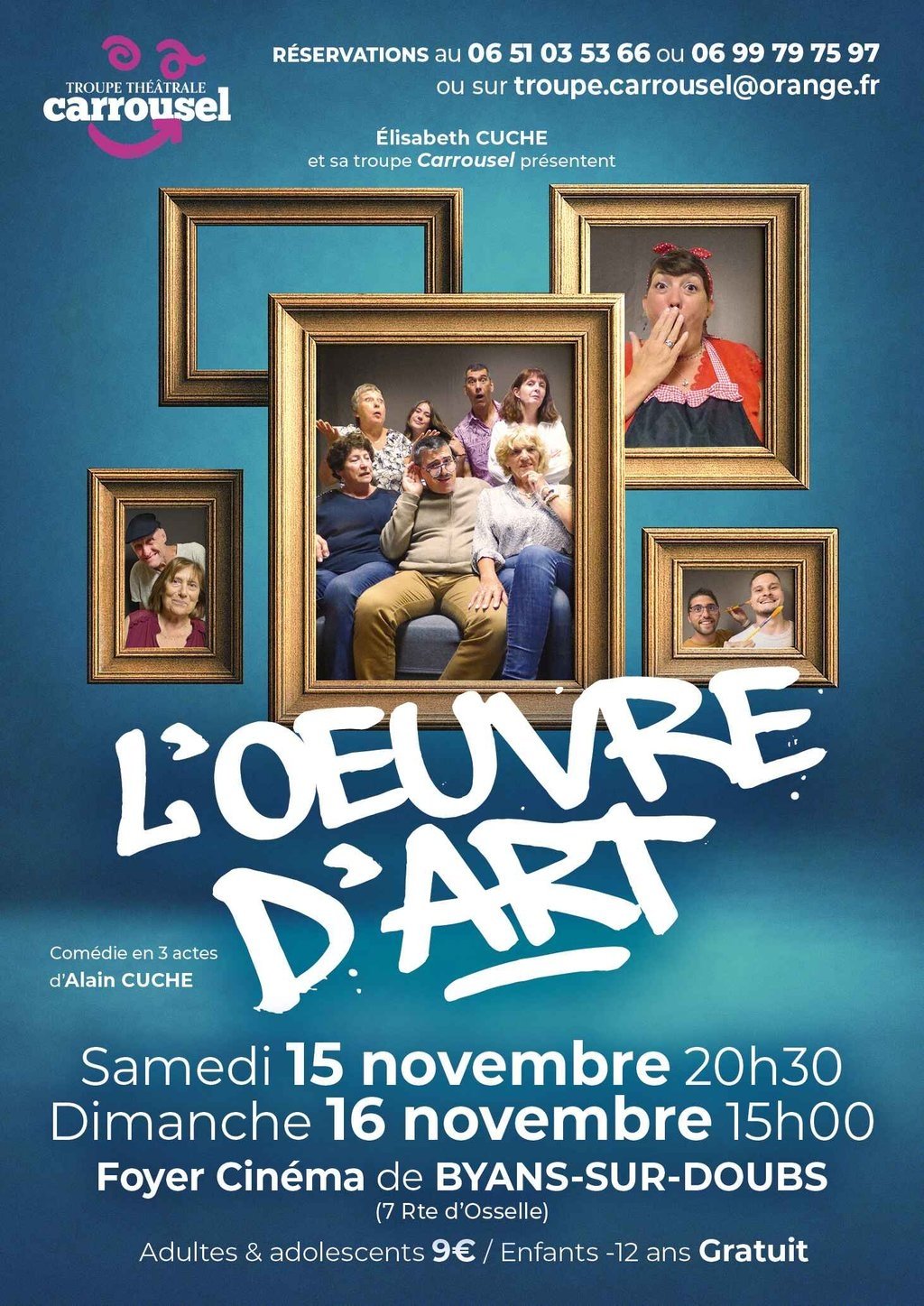 Élisabeth Cuche et la troupe Carrousel vous présentent leur nouvelle comédie en 3 actes "L'Oeuvre d'Art" le samedi 15 novembre à 20h30 et le dimanche 16 novembre à 15h00 au Foyer Cinéma.
